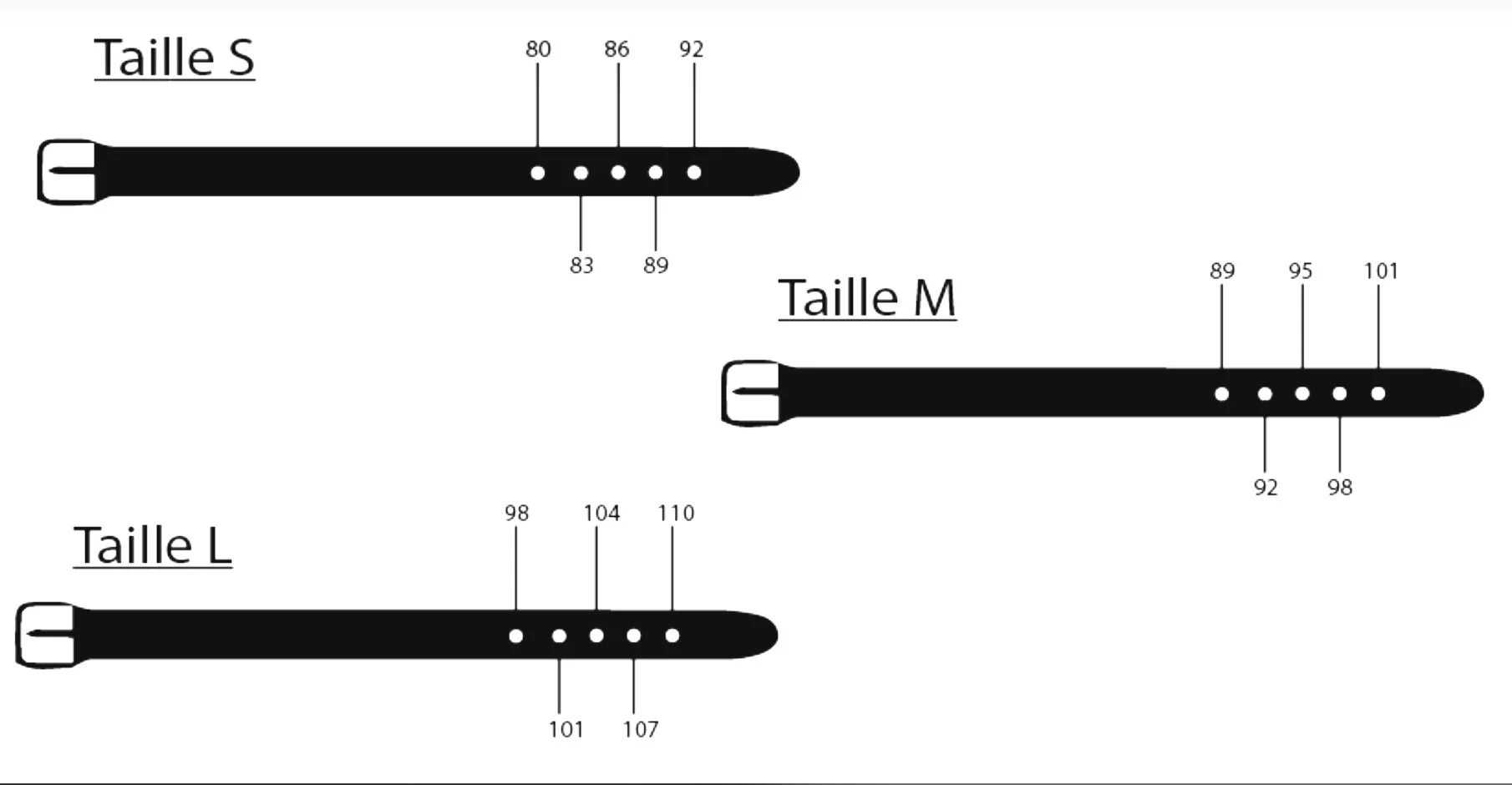 Mesurez votre ancienne ceinture, avec un mètre souple, de la tête de la boucle jusqu’au trou couramment utilisé. ( voir photos-ci dessous pour les tailles)